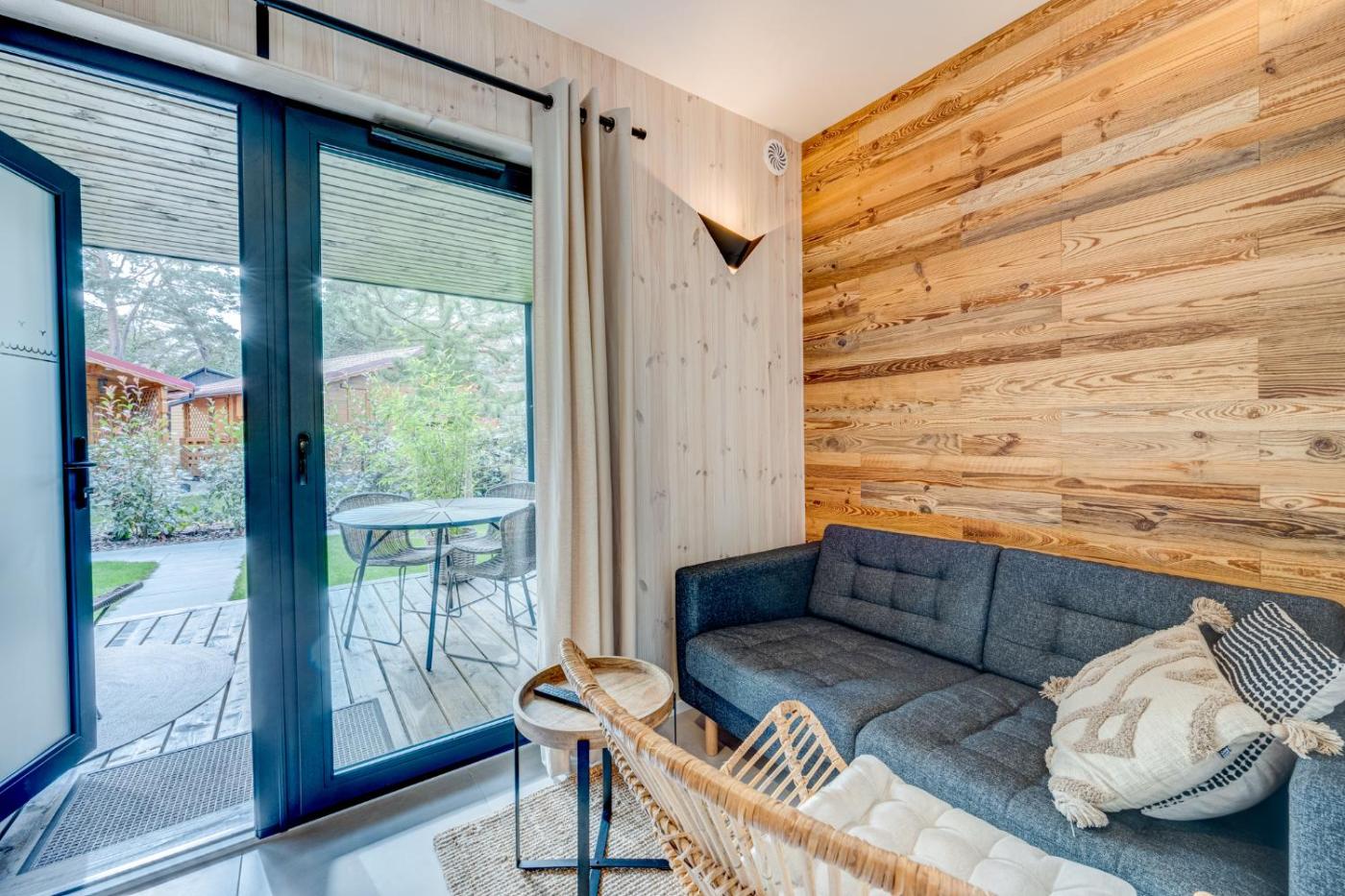 Dom z 1 sypialnią. Ten klimatyzowany dom wakacyjny z oddzielnym wejściem mieści salon, oddzielną sypialnię oraz łazienkę z prysznicem i suszarką do włosów. W dobrze wyposażonej kuchni przygotowano płytę kuchenną, lodówkę, zmywarkę do naczyń i przybory kuchenne. Na miejscu dostępny jest sprzęt do grillowania. Dom wakacyjny ma dźwiękoszczelne ściany. Udogodnienia obejmują telewizor z płaskim ekranem i dostępem do serwisów streamingowych oraz taras z widokiem na ogród. Do dyspozycji Gości są 2 łóżka. Dom wakacyjny - 3 osobowy. Powierzchnia pokoju ok.: 25 mkw. ;